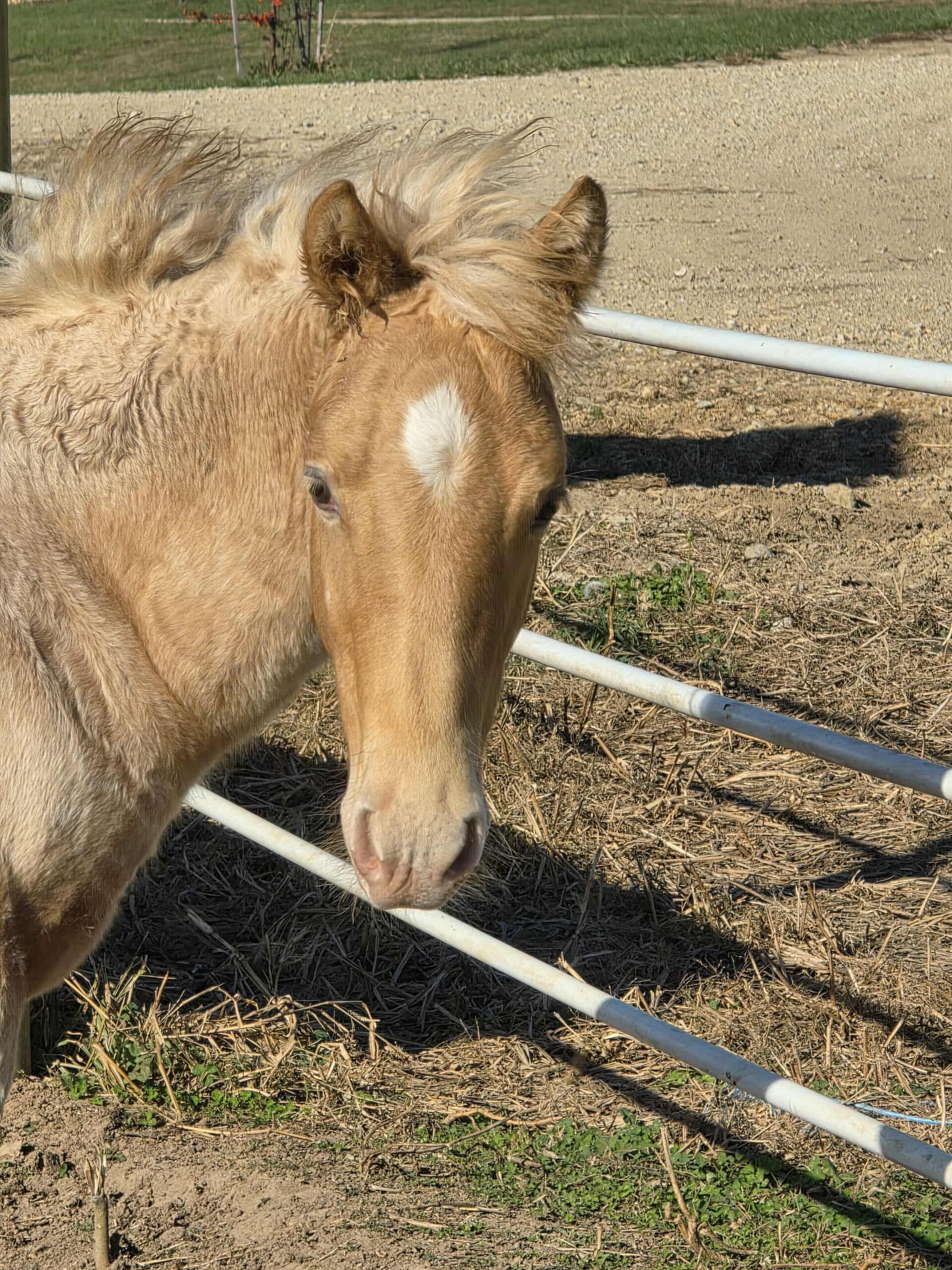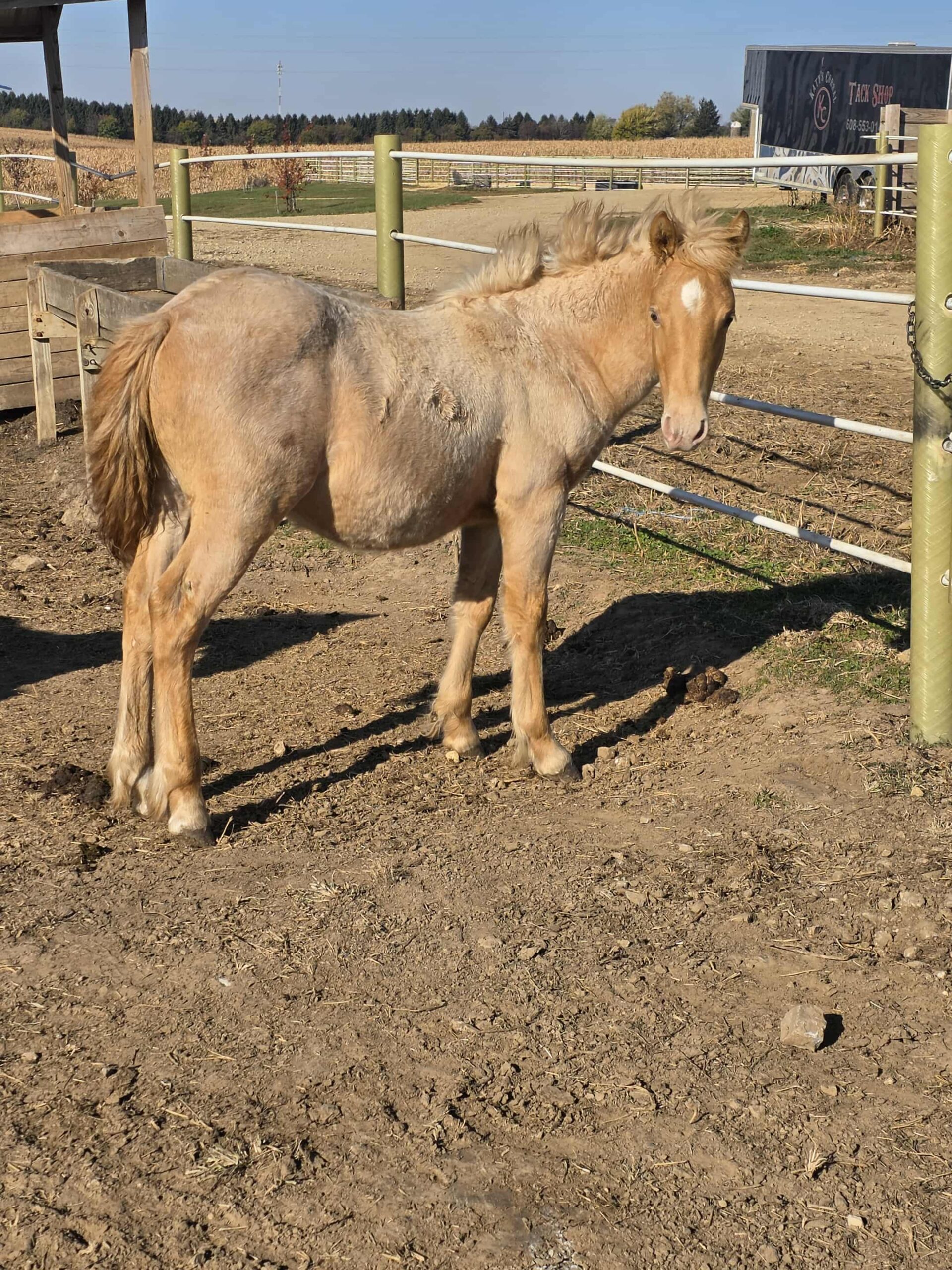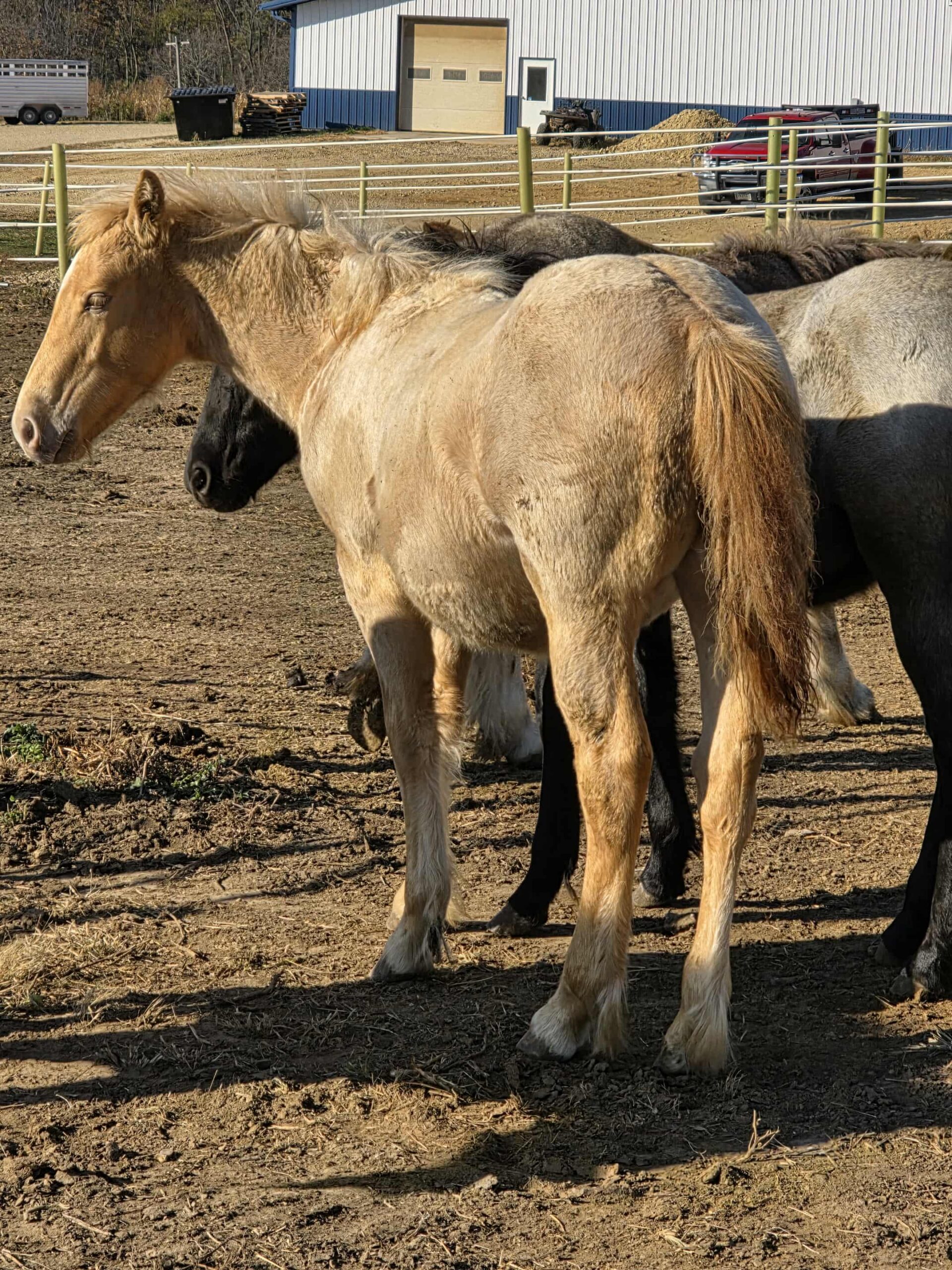 Wow is he unique! This colt is a CHAMPAGNE Gypsy Vanner cross stud colt born May 19th. His sire is Thorn Hill Whiskeys Tonka, my blue roan Gypsy Vanner stallion. This foal’s mom I bred and raised as well. She is by an AQHA champagne stallion who is an own son of Cattin and out of a cougarand bred mare. I can’t wait to see what this colt sheds off as when he loses his baby fuzz. He is will have that super shiney, metallic looking champagne coat. This foal is will be an absolute TANK when he grows up. He is the perfect cross of both breeds with his hairy legs, big bone and strength from his sire and his athleticism and agility of his dam. He has been naturally very smart, trainable and willing while we have handled him. He is the only champagne colored Gypsy cross I have ever seen. He will turn heads wherever he goes and if you want something that won’t look like everyone else’s then here’s the colt for you. We are offering a payment plan until weaning and I’m hoping someone snatches him up before I change my mind and keep him. Located in Dodgeville, WI and can ship anywhere in the U.S forty eight hundred Pictures of sire and his registration papers also included