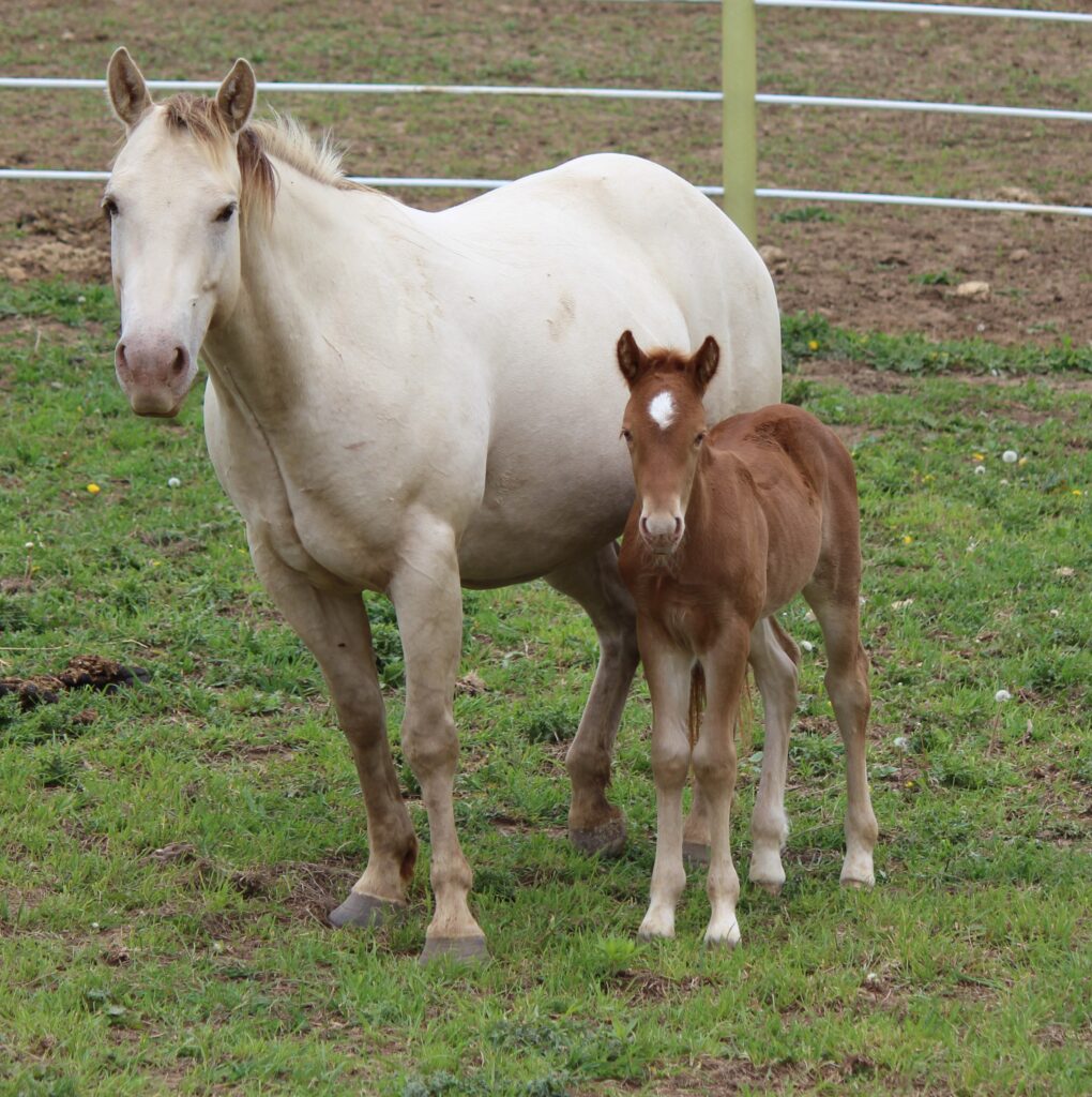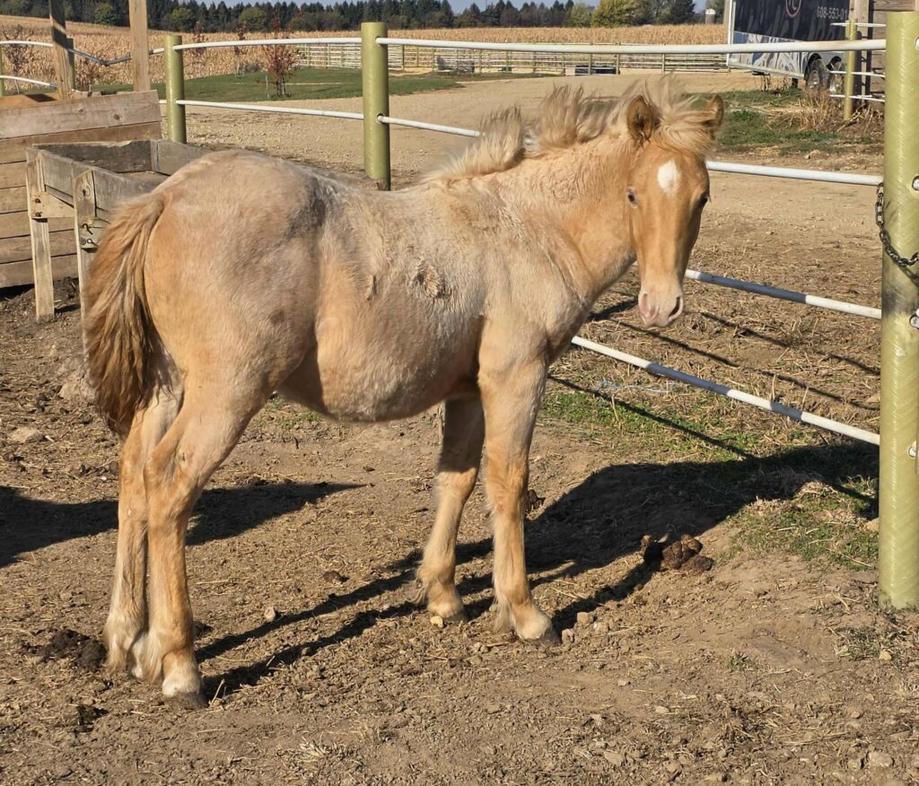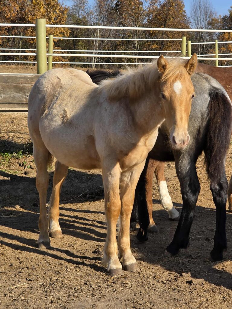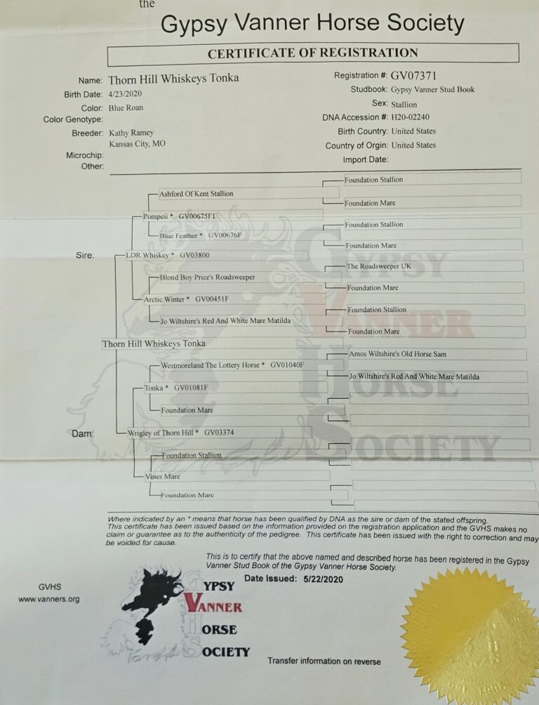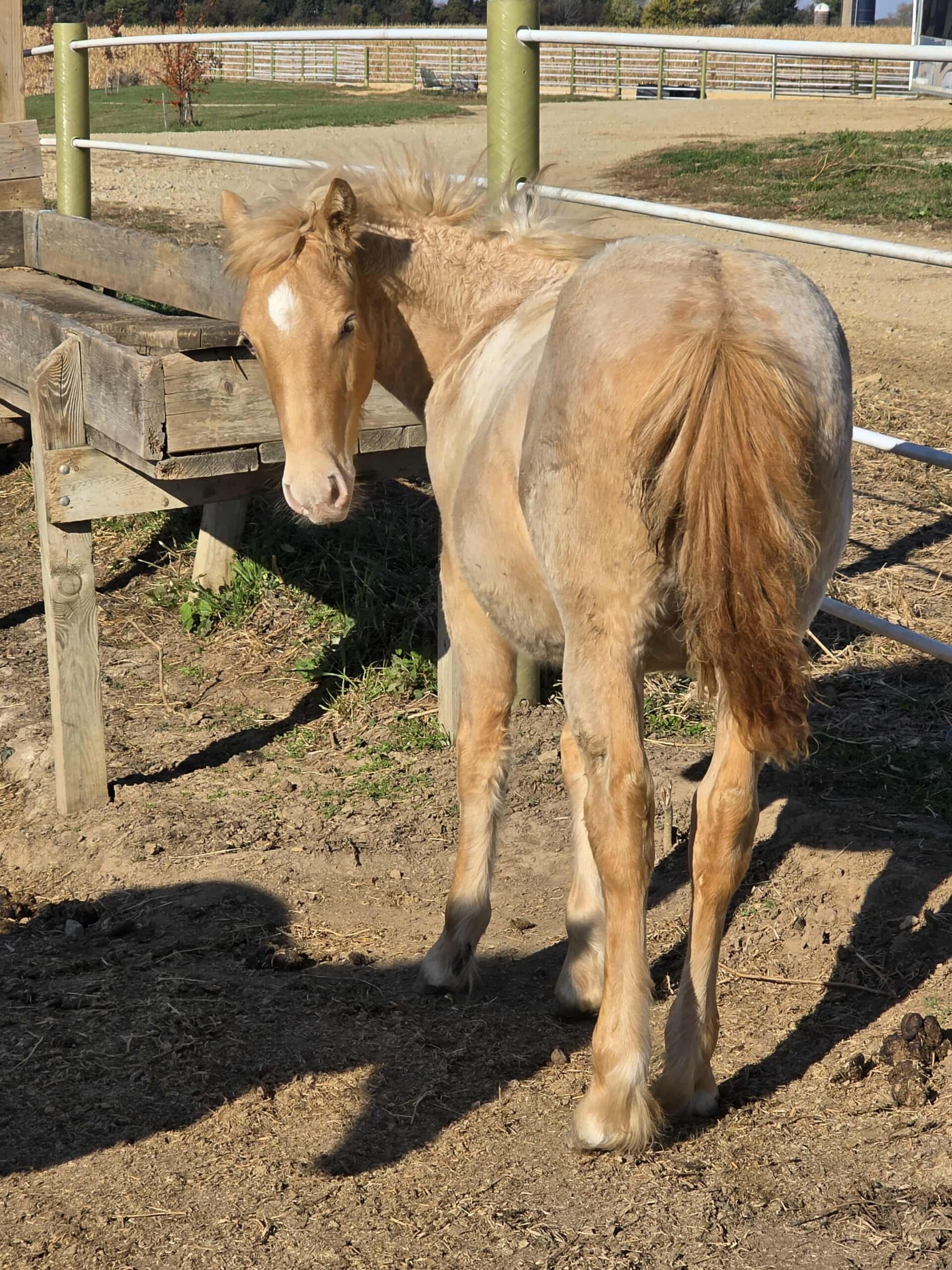 Wow is he unique! This colt is a CHAMPAGNE Gypsy Vanner cross stud colt born May 19th. His sire is Thorn Hill Whiskeys Tonka, my blue roan Gypsy Vanner stallion. This foal’s mom I bred and raised as well. She is by an AQHA champagne stallion who is an own son of Cattin and out of a cougarand bred mare. I can’t wait to see what this colt sheds off as when he loses his baby fuzz. He is will have that super shiney, metallic looking champagne coat. This foal is will be an absolute TANK when he grows up. He is the perfect cross of both breeds with his hairy legs, big bone and strength from his sire and his athleticism and agility of his dam. He has been naturally very smart, trainable and willing while we have handled him. He is the only champagne colored Gypsy cross I have ever seen. He will turn heads wherever he goes and if you want something that won’t look like everyone else’s then here’s the colt for you. We are offering a payment plan until weaning and I’m hoping someone snatches him up before I change my mind and keep him. Located in Dodgeville, WI and can ship anywhere in the U.S forty eight hundred Pictures of sire and his registration papers also included